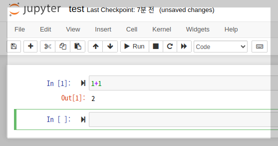 '1 + 1'을 입력하고 연산 결과를 알아봅니다. 엔터는 같은 셀(cell)에서 줄 바꿈이 되기 때문에 연산 결과를 알기 위해서는 특수키와 함께 '엔터'를 입력합니다. 'Ctrl + Enter'를 사용하면 현재 셀을 실행만 하고 새 셀로 이동하지 않습니다. 'Shift + Enter'를 사용하면 셀을 실행하고 다음 셀로 이동하거나 새 셀을 생성합니다.