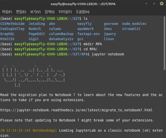 리눅스에서 파이썬을 하기 위해 주피터 노트북을 실행합니다. 터미널에 'jupyter notebook'을 입력하여 실행하면 시스템 자체 노트북 서버가 실행이 되면서 웹브라우저에서 코딩을 할 수 있습니다.