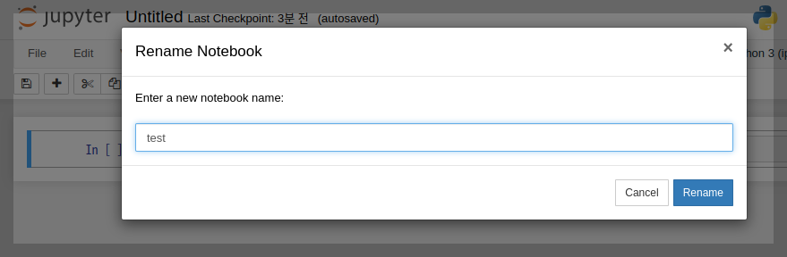 노트북 파일 제목 'untitled'를 클릭하면 아래와 같이 창이 생기면서 이름을 변경할 수 있습니다. 여기서는 'test'를 입력했습니다. 노트북은 코드와 텍스트를 함께 작업할 수 있는 코드 편집기를 의미합니다.