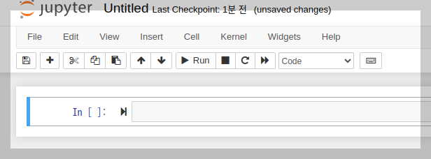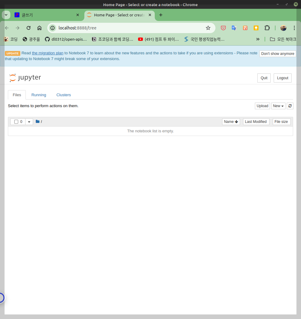리눅스에서 파이썬을 하기 위해 주피터 노트북을 실행합니다. 터미널에 'jupyter notebook'을 입력하여 실행하면 시스템 자체 노트북 서버가 실행이 되면서 웹브라우저에서 코딩을 할 수 있습니다.