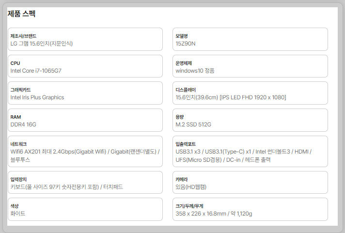 포트: USB3.1 x3 / USB3.1(Type-C) x1 / Intel 썬더볼트3 / HDMI / UFS(Micro SD) / DC-in / 헤드폰 출력