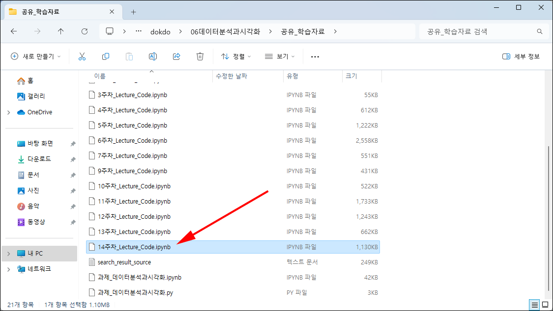 - 자료가 담긴 폴더에서 노트북 실행: 자료가 담긴 폴더에서 경로를 확인합니다. 경로명을 복사하여 아나콘다 프롬프트(Anaconda Prompt)에서 해당 경로로 이동한 후 'jupyter notebook'을 실행합니다.