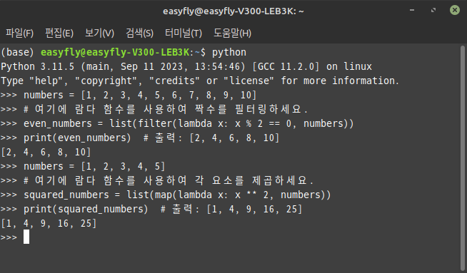 - 주어진 리스트의 각 요소를 제곱하는 람다 함수를 작성하세요.