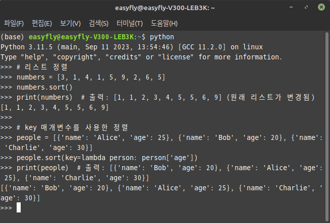 print(numbers) # 출력: [1, 1, 2, 3, 4, 5, 5, 6, 9] (원래 리스트가 변경됨)
