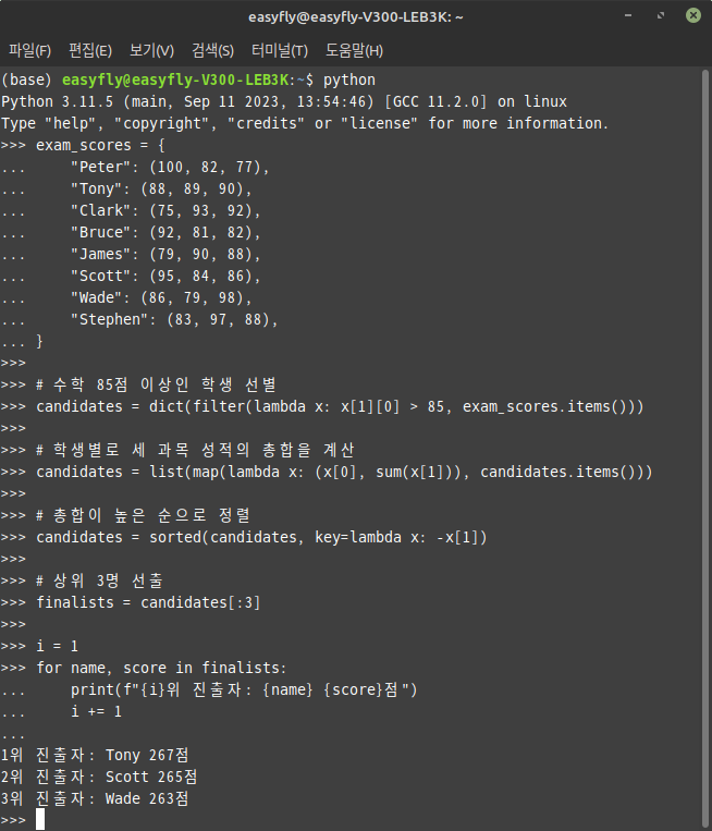 exam_scores딕셔너리에서 수학 성적이 85점 이상인 학생들을 선별합니다.- 선별된 학생들의 세 과목 성적의 총합을 계산합니다.