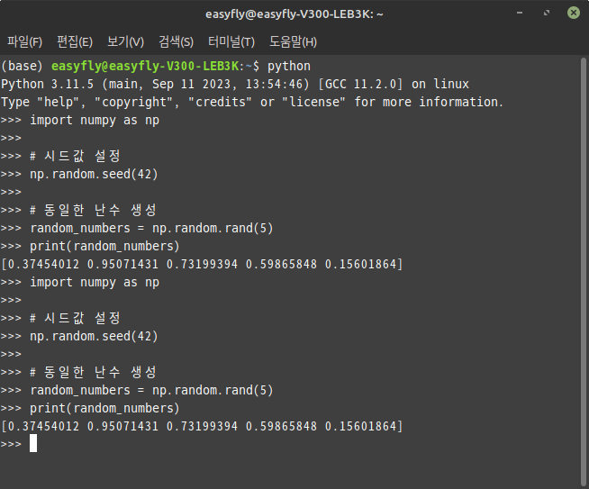 아래는 무작위로 수를 생성하는 예제입니다. 시드값을 설정했을 때와 설정하지 않았을 때의 차이를 보여줍니다.