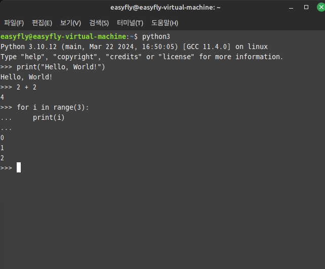 >>> print("Hello, World!") Hello, World! >>> 2 + 2 4 >>> for i in range(3): ... print(i) ... 0 1 2