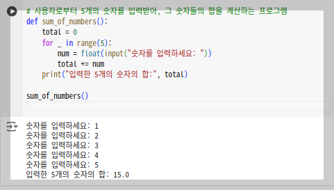 - 사용자로부터 5개의 숫자를 입력받아, 그 숫자들의 합을 계산하는 프로그램을 작성해 보세요.