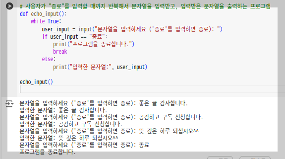 - 사용자가 "종료"를 입력할 때까지 반복해서 문자열을 입력받고, 입력받은 문자열을 출력하는 프로그램을 작성해 보세요.