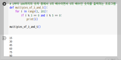 - 1부터 100까지의 숫자 중에서 3의 배수이면서 5의 배수인 숫자를 출력하는 프로그램을 작성해 보세요.