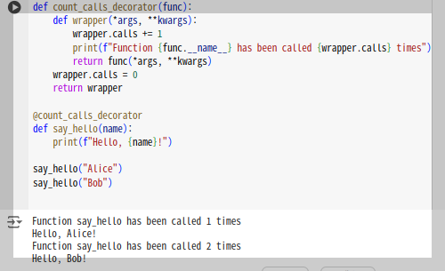 - 함수 호출 횟수를 세는 데코레이터를 작성하세요. 각 호출 시마다 누적 호출 횟수를 출력해야 합니다.