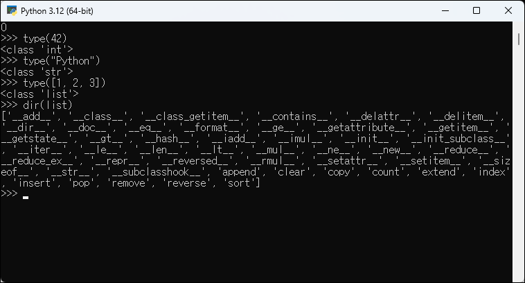 type()함수를 사용하여 숫자, 문자열, 리스트의 타입을 출력해 보세요. dir()함수를 사용하여 리스트가 가지고 있는 메서드들을 나열해 보세요.