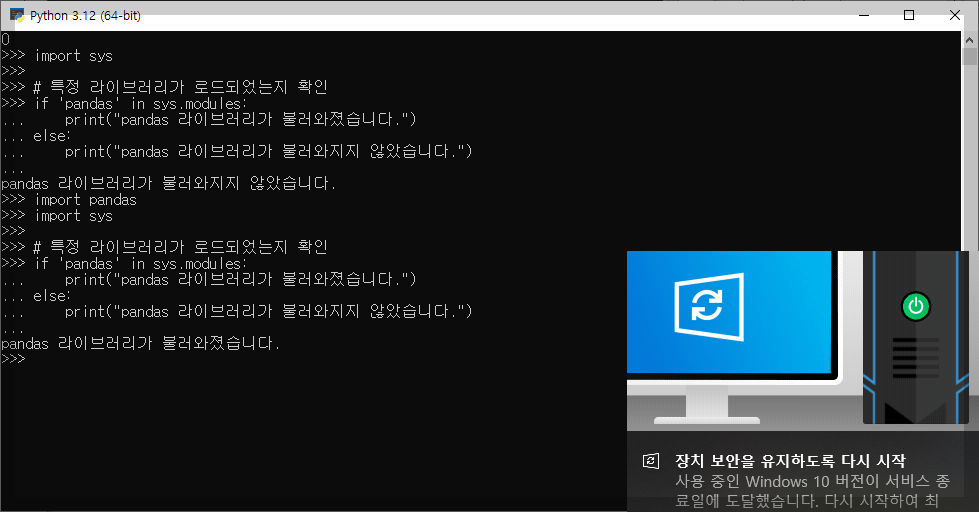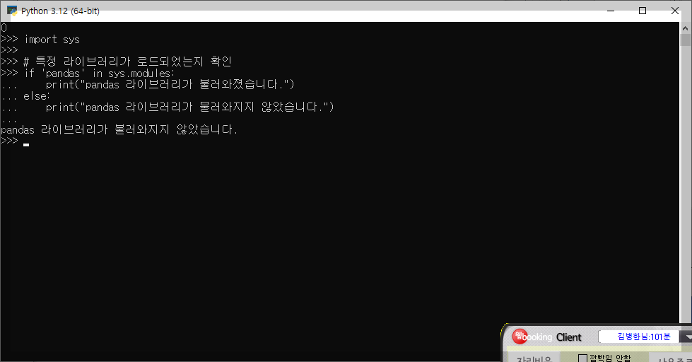 특정 라이브러리가 불러와졌는지 확인하고 싶다면, 해당 라이브러리 이름이 sys.modules에 있는지 확인할 수 있습니다. 예를 들어, pandas 라이브러리가 불러와졌는지 확인하려면 다음과 같이 할 수 있습니다: