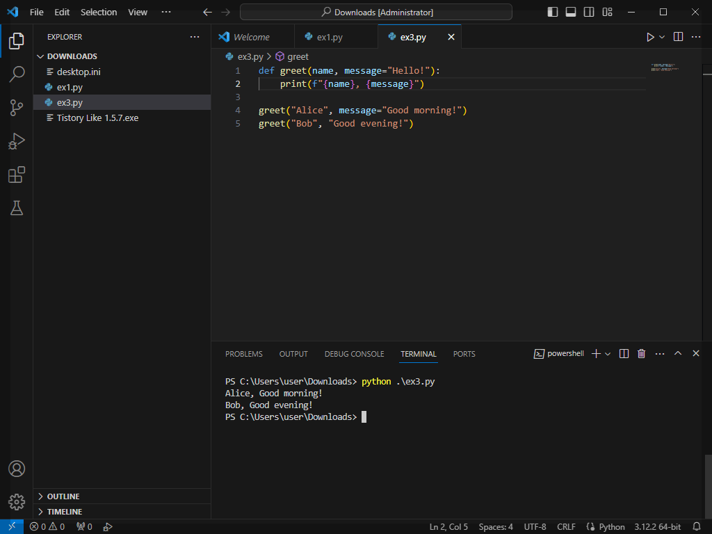 위 코드에서 `greet("Alice", "Good morning!")`는 `name` 매개변수에 `"Alice"`를, `message` 매개변수에 `"Good morning!"`을 위치에 맞게 전달합니다.