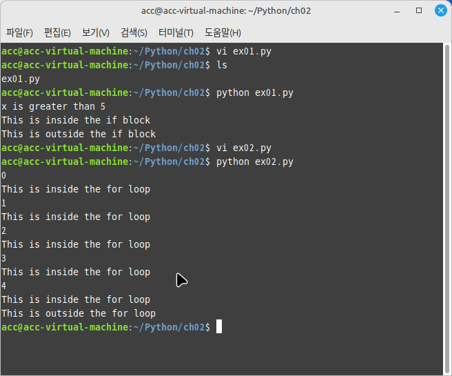 이 예시에서는 for 루프 내부에 들여쓰기 된 두 줄의 코드가 있습니다. 이 코드는 루프가 실행될 때마다 반복됩니다. 루프가 끝나면 들여쓰기가 되지 않은 코드가 실행됩니다.