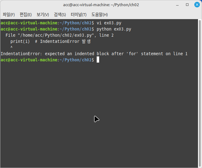 파이썬에서는 들여쓰기가 잘못되면 IndentationError라는 오류가 발생합니다. 예를 들어, 들여쓰기 없이 루프 안에서 코드를 작성하거나, 들여쓰기의 양이 일관되지 않으면 오류가 발생합니다.