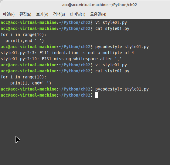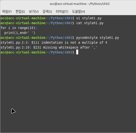 pycodestyle로 점검했더니 두 가지 내용을 지적하는군요. 하나는 들여쓰기를 정확하게 지키지 않았다는 것입니다. 두 번째는 인수를 구별하는 콤마 다음에 스페이스를 주지 않았다는 내용입니다.