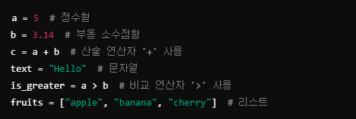 - 정의: 자료형은 변수에 저장되는 데이터의 유형을 정의합니다. 파이썬은 다양한 기본 자료형을 제공합니다.