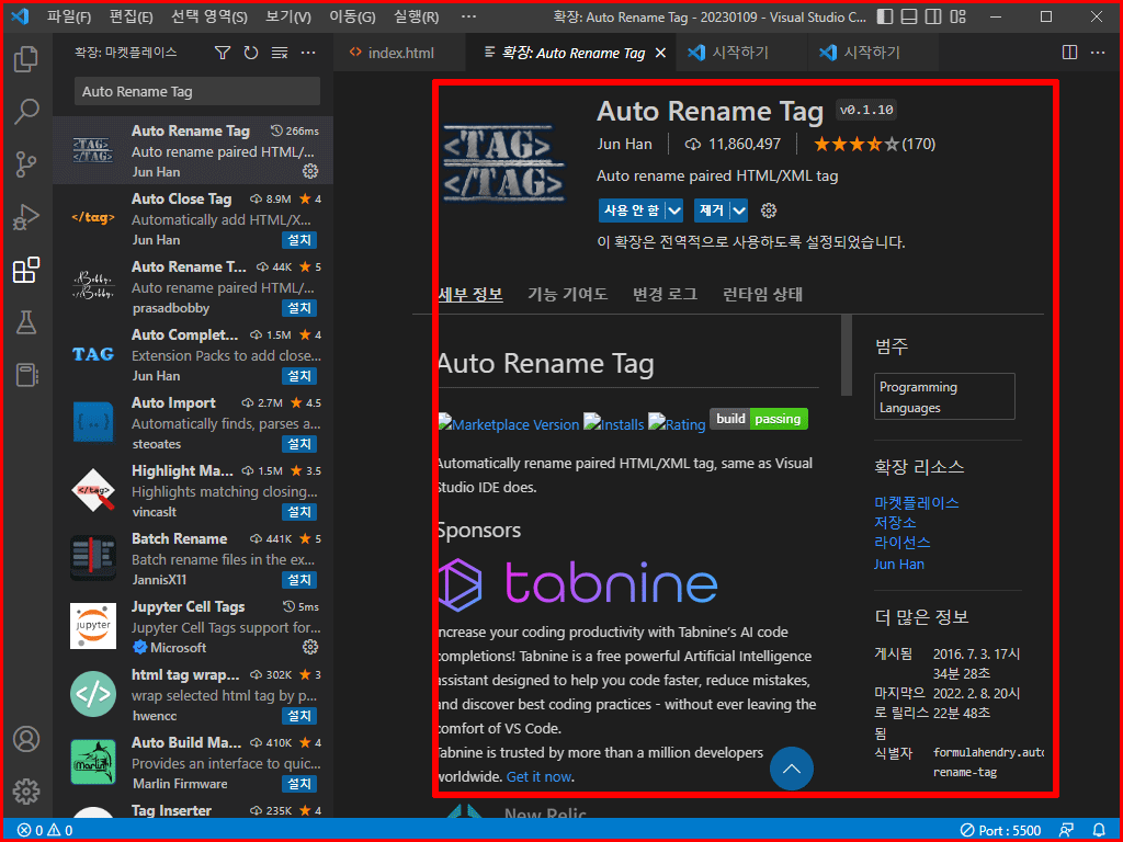HTML 태그는 시작 태그와 종료 태그로 구성됩니다. 이 두 태그는 항상 쌍을 이뤄야 하는데 만약 한쪽 태그를 변경하면 쌍을 이루는 다른 쪽 태그도 변경해야 합니다. 이 작업을 자동으로 해주는 확장 프로그램이 Auto Rename입니다.