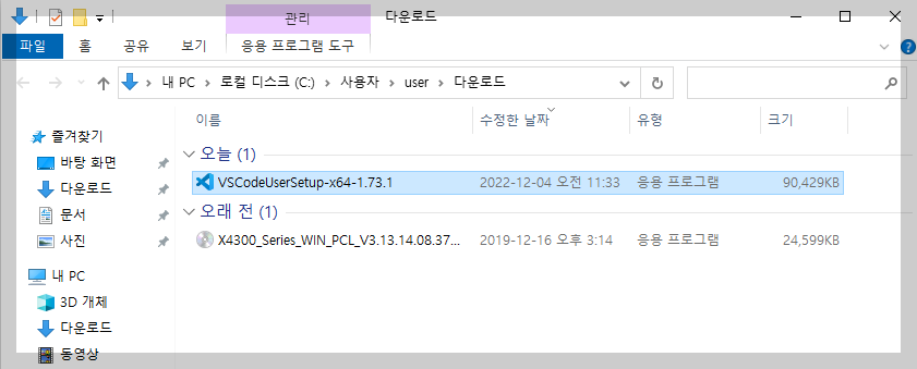 다운로드 폴더로 이동해서 설치 파일을 클릭하여 프로그램을 설치합니다.