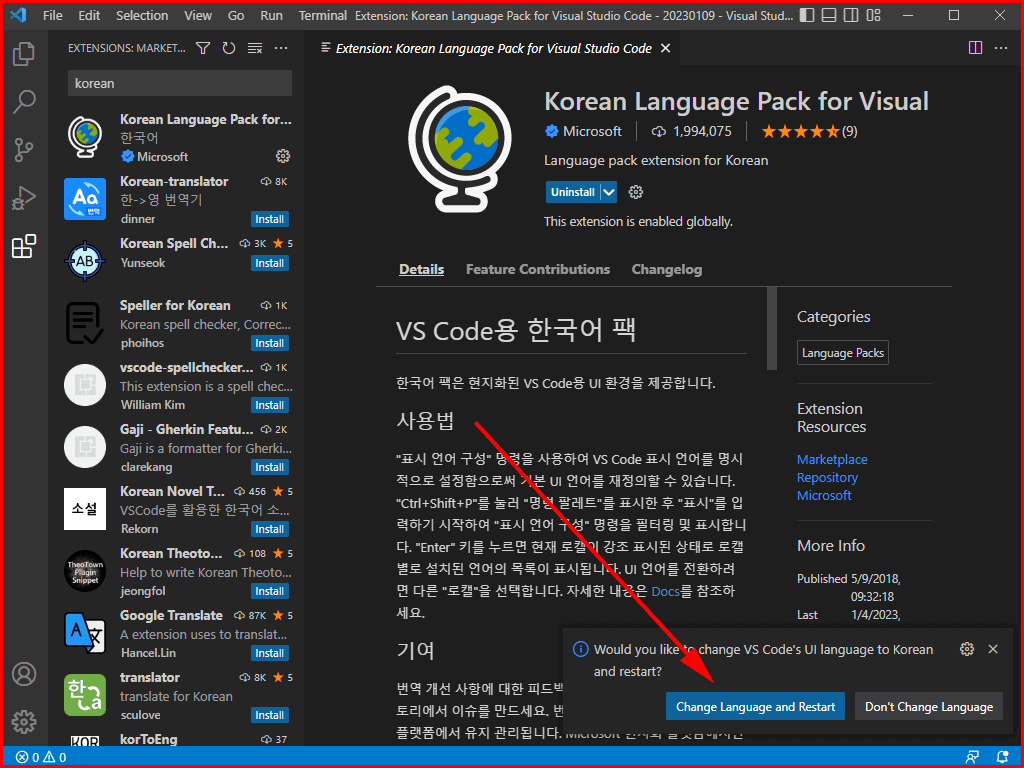 VSCcode에는 코드 작성에 유익한 확장 프로그램(Extension)이 많습니다. 이를 잘 활용하면 코드 생산성을 높일 수 있습니다. 한글 확장프로그램(Korean Language Pack for Visual Studio Code / Microsoft)을 설치하면 메뉴와 설명을 한글로 변경합니다.