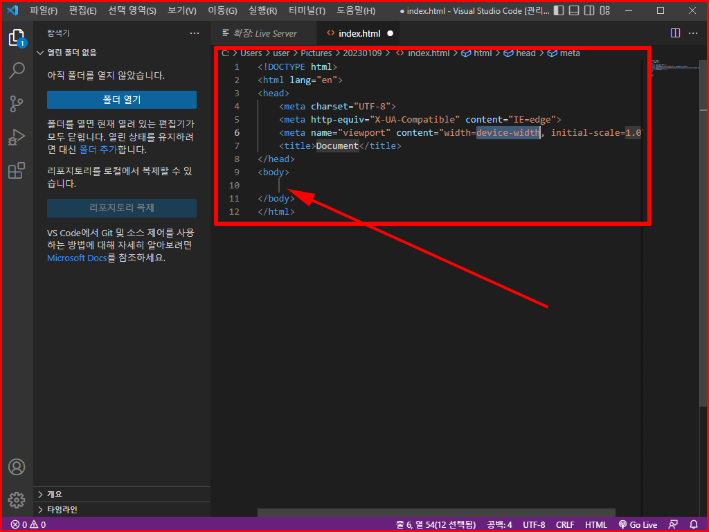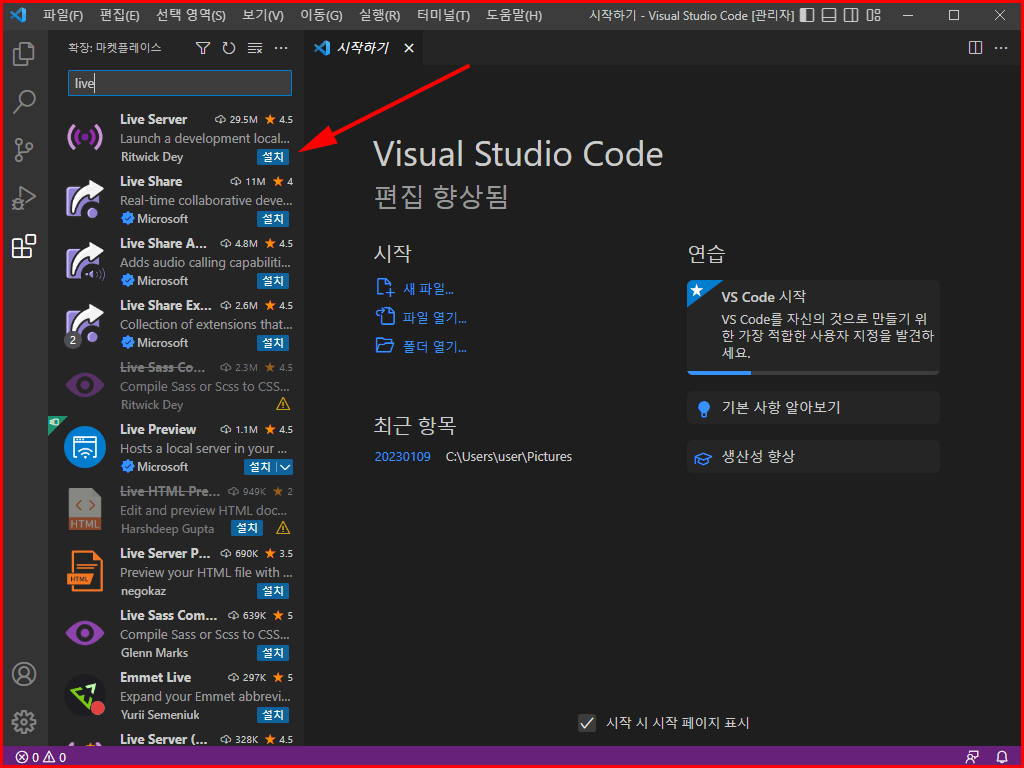라이브 서버 확장 프로그램(Live Server / Ritwick Dey)은 작성한 HTML 코드를 실시간으로 확인할 수 있는 확장팩입니다. 코드를 작성하고 저장하면 Live Server와 연동된 HTML 문서가 실시간으로 반영되어 실행 결과를 확인할 수 있습니다.