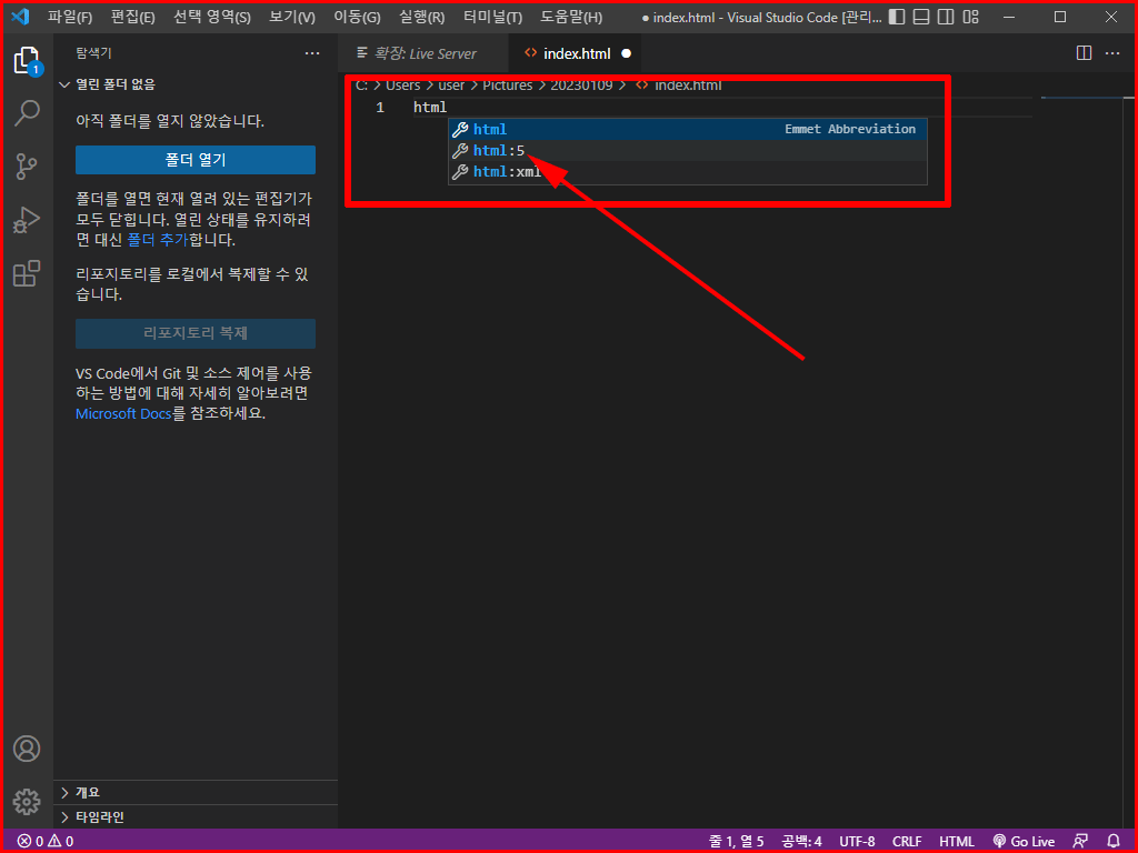 초기 설정을 마쳤으니 간단한 코딩을 하겠습니다. 열려진 폴더에 'index.html' 파일을 생성하고 코딩을 시작합니다. 첫 줄에 'html'을 타이핑했더니 자동으로 완성할 내용을 보여줍니다. 'html:5'를 선택합니다.