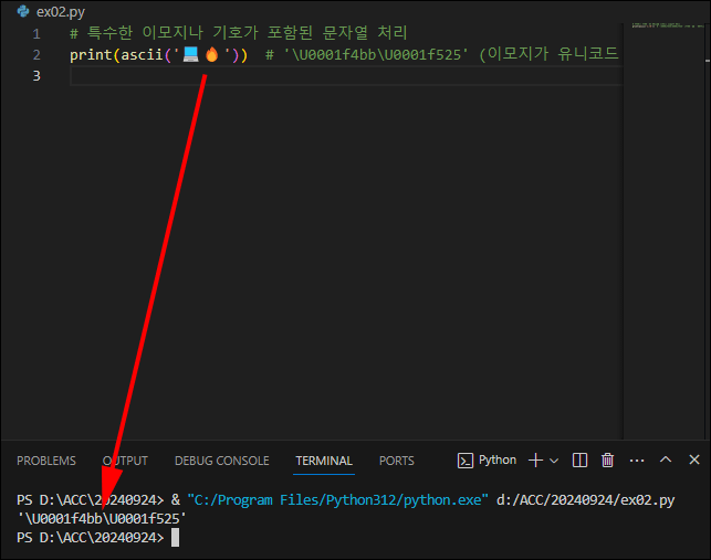 print(ascii('💻🔥')) # '\U0001f4bb\U0001f525' (이모지가 유니코드 이스케이프로 변환됨)