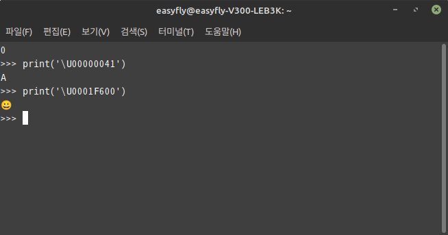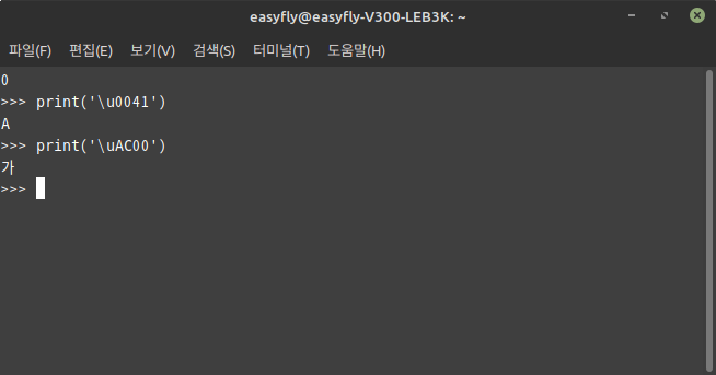 print('\u0041') # 출력: 'A' (U+0041은 문자 'A'에 해당)