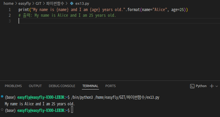 print("My name is {name} and I am {age} years old.".format(name="Alice", age=25))