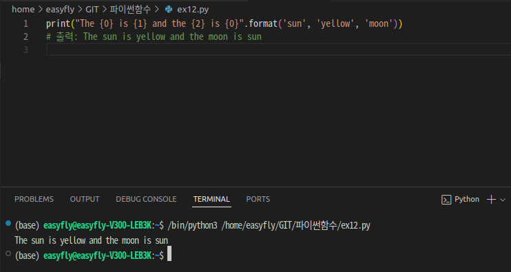 print("The {0} is {1} and the {2} is {0}".format('sun', 'yellow', 'moon'))