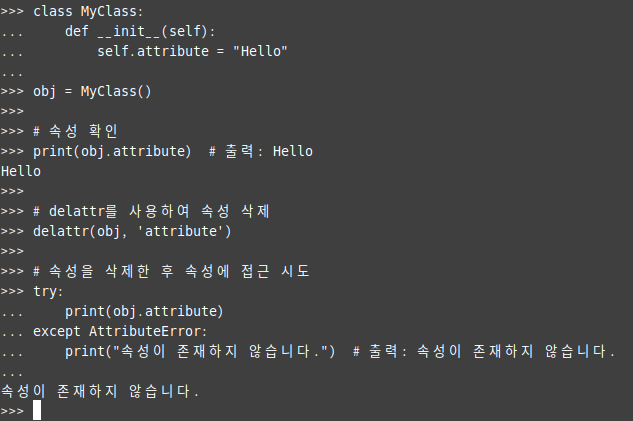 AttributeError가 발생하므로 예외 처리가 필요할 수 있습니다. delattr()로 삭제된 속성은 더 이상 객체에서 사용할 수 없습니다.