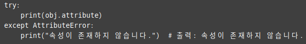 print("속성이 존재하지 않습니다.") # 출력: 속성이 존재하지 않습니다.
