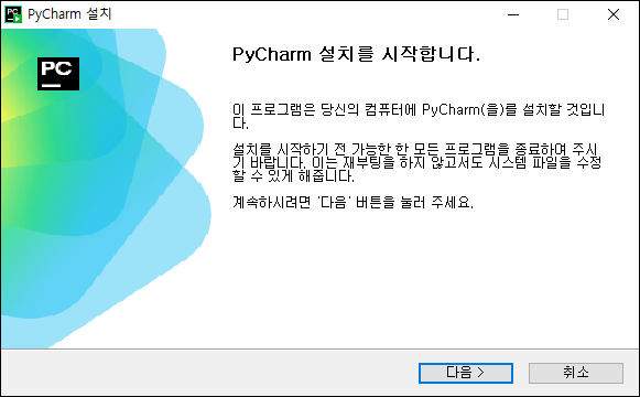 - PyCharm 설치 프로그램을 실행하면, "PyCharm 설치를 시작합니다."라는 화면이 나타납니다.
