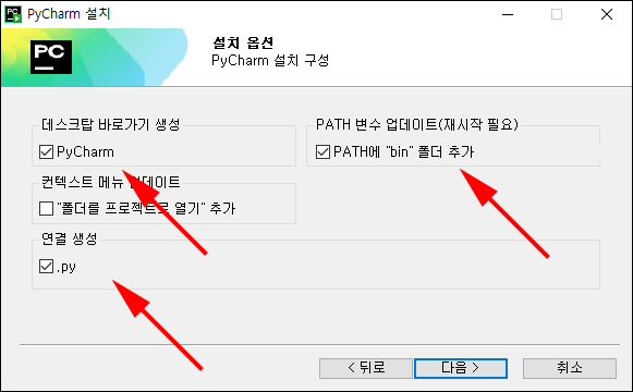 - 바로가기 생성: 바탕화면에 PyCharm 바로가기를 생성할지 여부를 선택합니다.