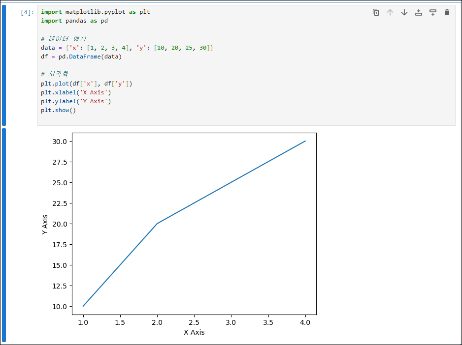 Jupyter Notebook에서는 Matplotlib와 Pandas 같은 라이브러리를 사용하여 데이터를 시각화하고 분석할 수 있습니다. 예를 들어: