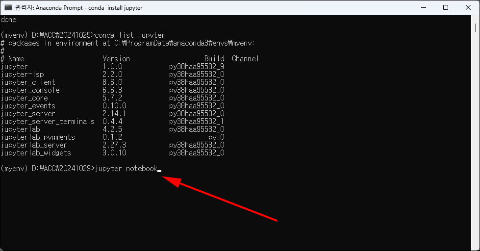 실행이 안 되는 경우가 있습니다. 이 경우는 새로 만든 가상 환경이 jupyter 패키지가 설치되어 있지 않기 때문에 발생하는 문제입니다. 그런 경우는 먼저 jupyter 패키지를 설치하고 'jupyter notebook'으로 실행해야 합니다.