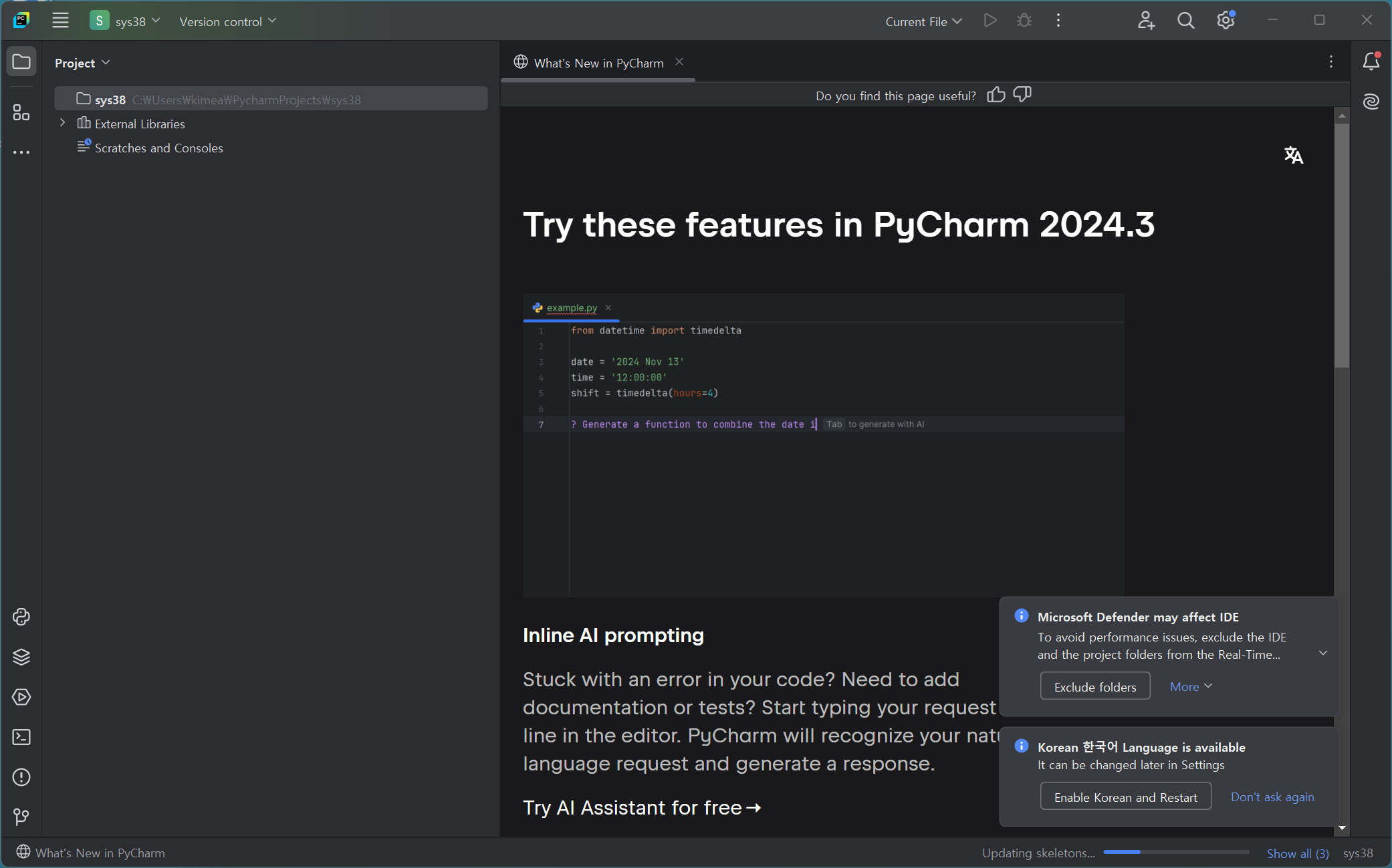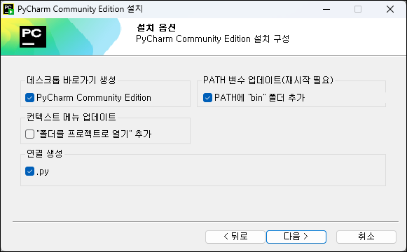.py파일을 PyCharm으로 열 수 있게 설정. - Path 환경 변수 추가: 명령 프롬프트에서 PyCharm 실행 가능.