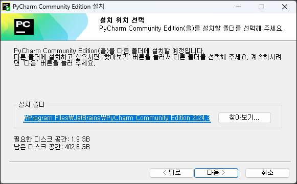 C:\Program Files\JetBrains\PyCharm Community Edition입니다. - 변경하려면 "Browse..." 버튼을 클릭해 다른 폴더를 선택합니다.