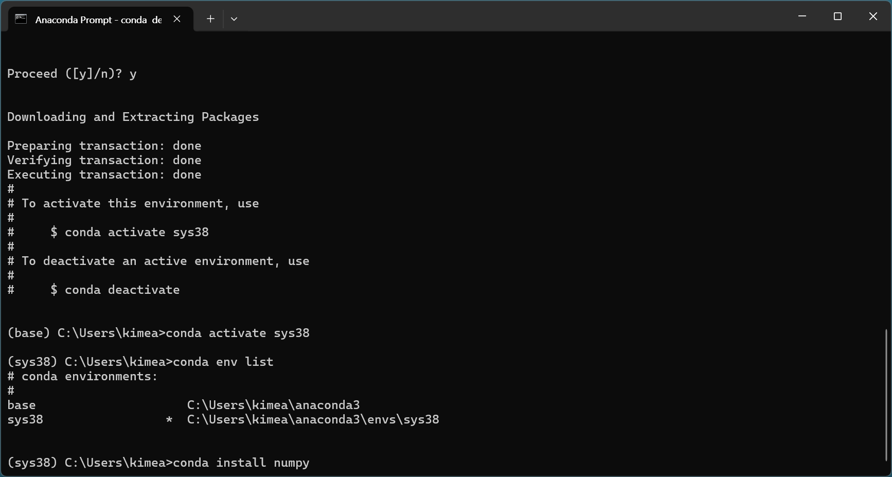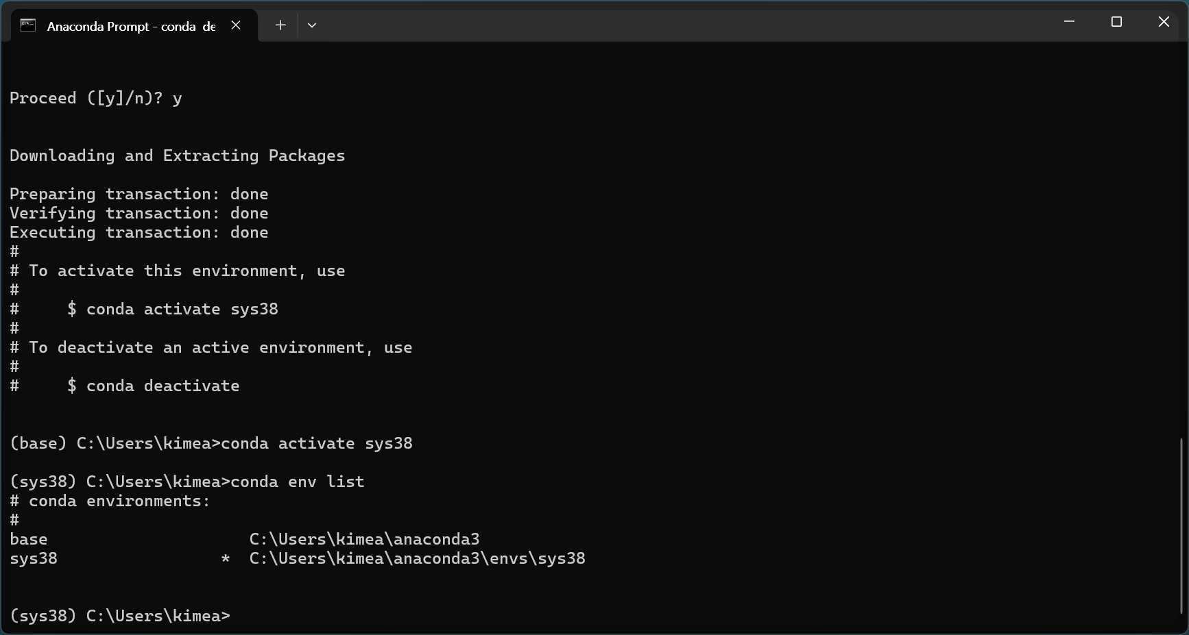 활성화되면 프롬프트에 (sys38)가 표시되어 활성화 상태임을 알 수 있습니다.