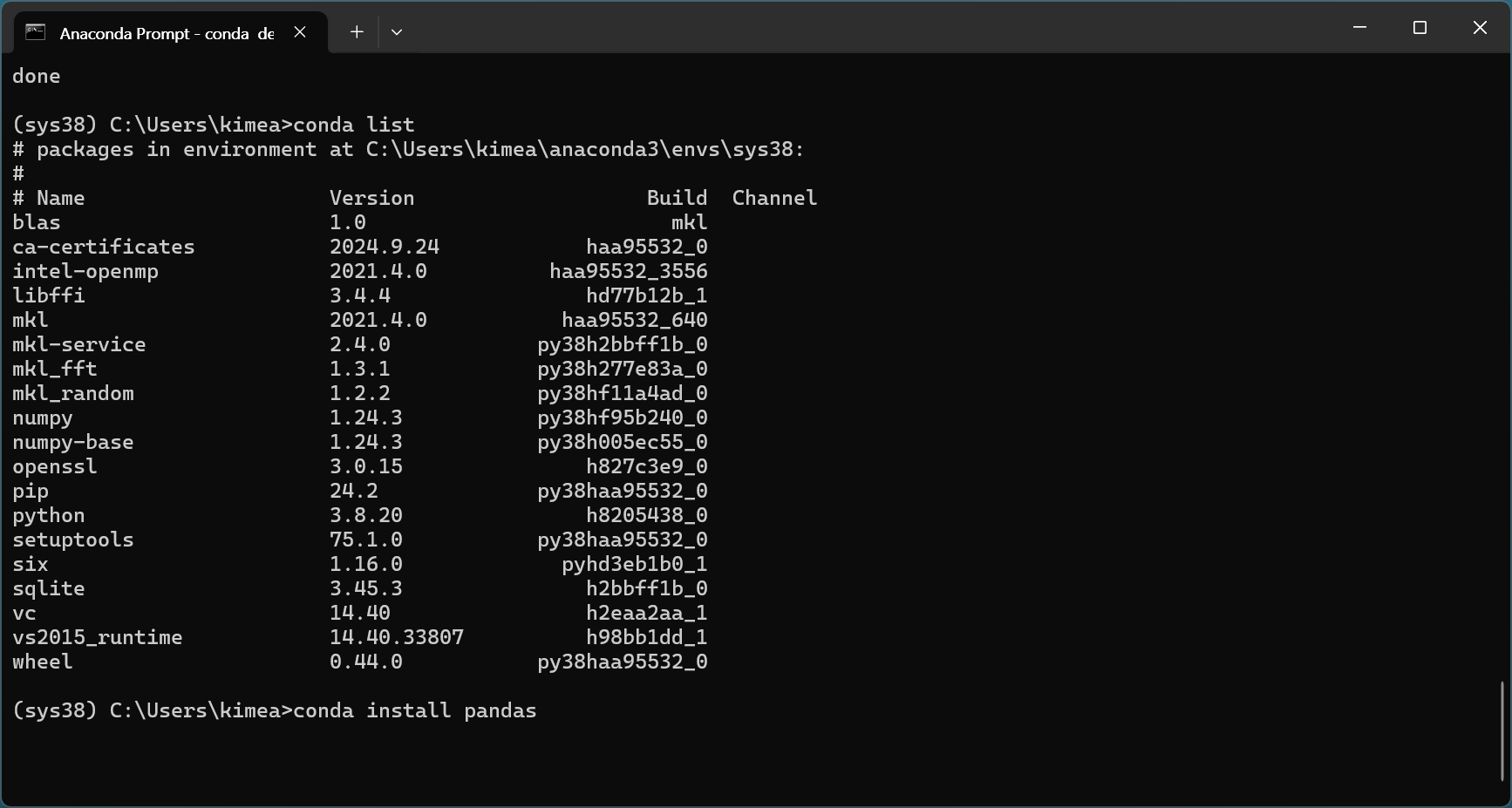 -n sys38는 가상환경의 이름을sys38으로 지정합니다.python=3.8은 해당 가상환경에서 Python 3.8 버전을 설치하도록 설정합니다.