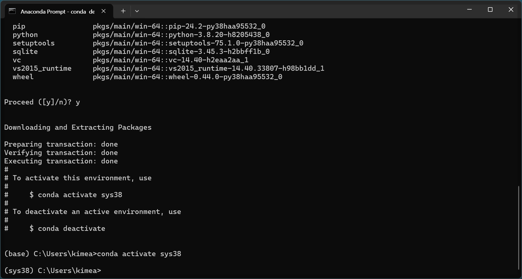 활성화되면 프롬프트에 (sys38)가 표시되어 활성화 상태임을 알 수 있습니다.