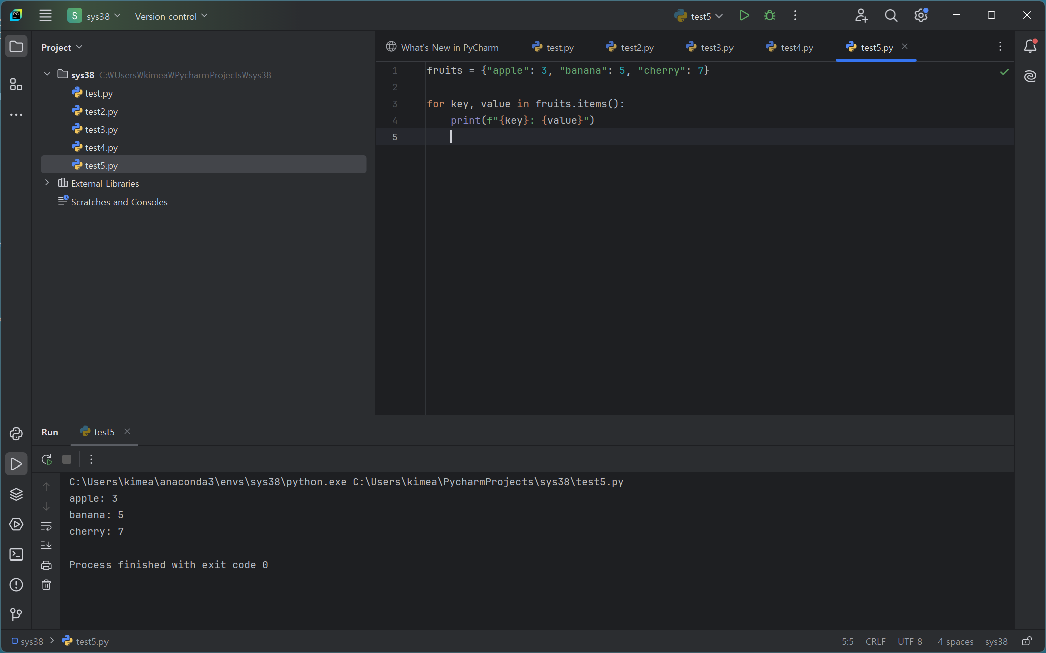fruits = {"apple": 3, "banana": 5, "cherry": 7}