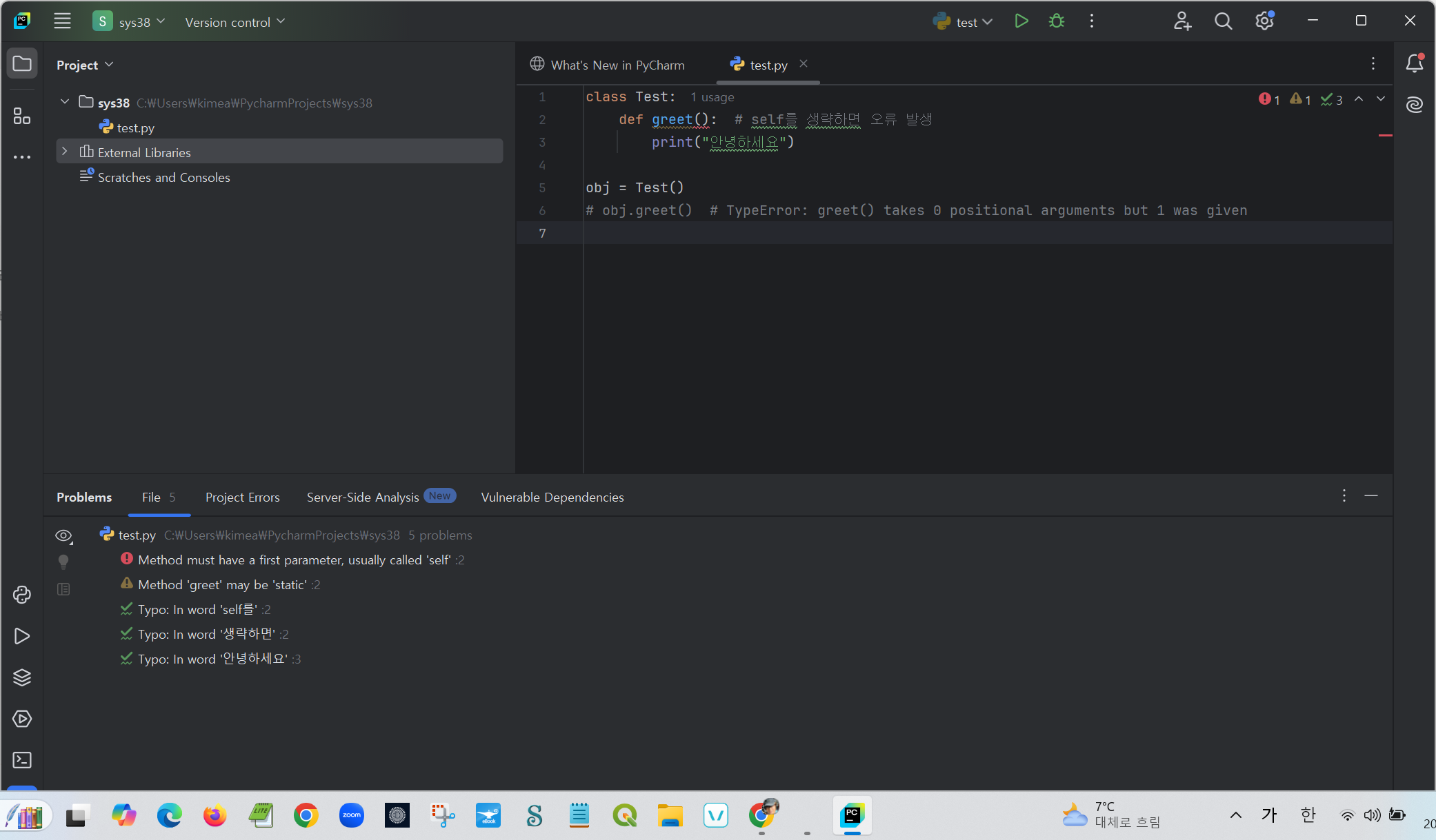 self를 생략하면 객체가 메서드를 호출할 때, Python이 객체를 전달하지 않으므로 오류가 발생합니다.class Test: def greet(): # self를 생략하면 오류 발생 print("안녕하세요") obj = Test() obj.greet() # TypeError: greet() takes 0 positional arguments but 1 was given