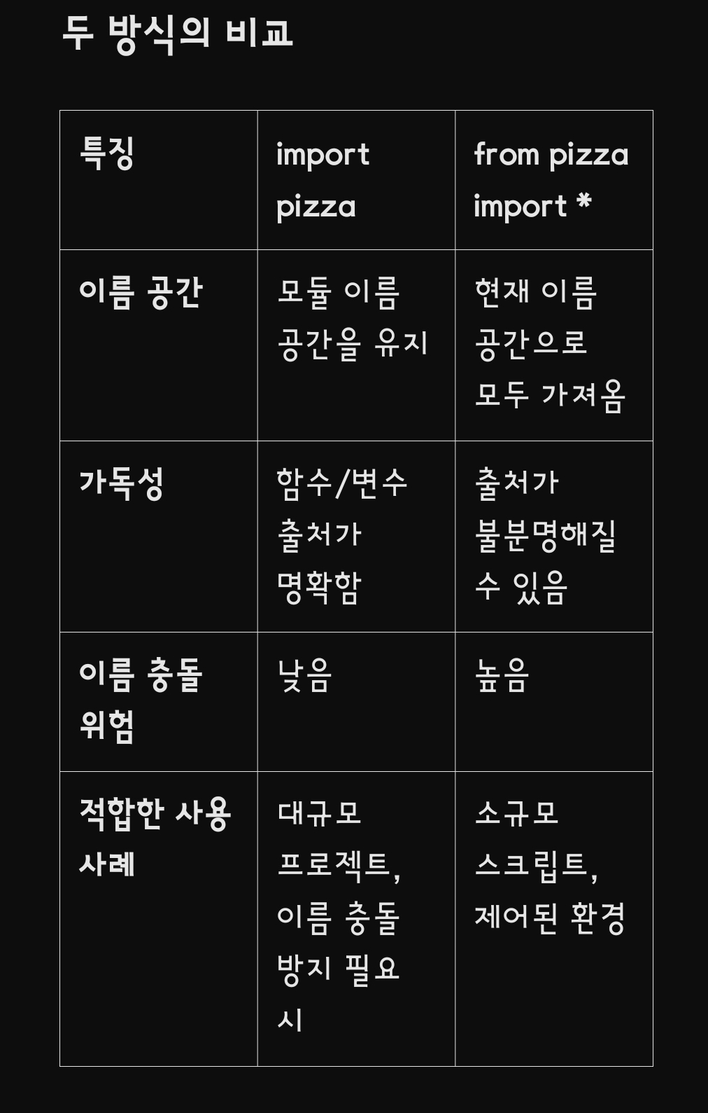 import pizza: 명확성과 유지보수성이 중요할 때 사용.from pizza import *: 간결함이 중요하거나, 테스트용 스크립트처럼 작은 코드에서 사용. 하지만 대규모 코드에서는 사용을 지양하는 것이 좋습니다.