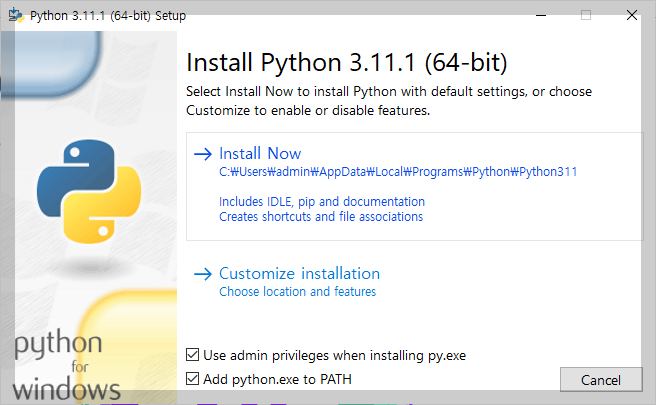 패스에 등록하는 이유는 어떤 폴더에서 파이썬을 실행해도 파이썬이 실행될 수 있도록 하기 위함입니다. 위에 있는 'Install Now'를 클릭하여 설치를 시작합니다. 아래 'Customize installation'은 자신이 옵션을 설정해서 설치하는 것입니다.
