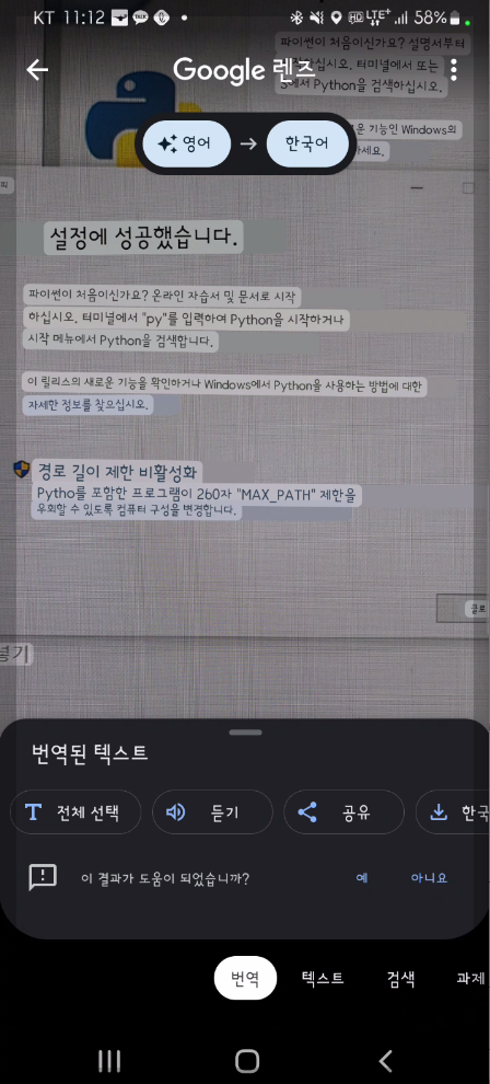 아래 경고 표시가 떴네요. 영어가 달려 구글 렌즈로 번역을 시켰습니다. 방법은 컴퓨터 화면에 스마트폰에서 구글 렌즈를 실행하여 들이밀었습니다. 아래와 같이 번역을 했네요. 경로 길이 제한을 없애겠냐는 얘기군요.