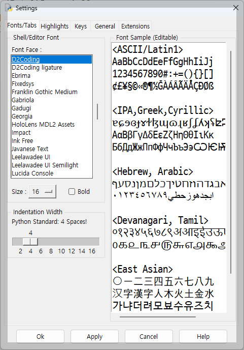 - IDLE: Options > Configure IDLE > Fonts/Tabs에서 적용.