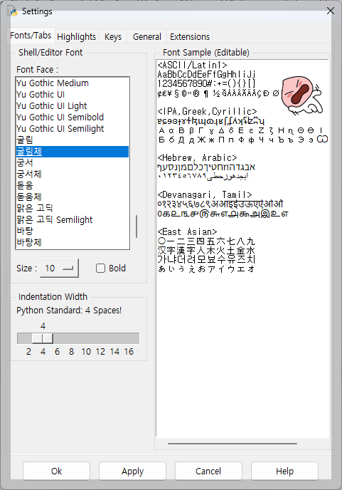 - 설치 후, IDLE 또는 IDE(예: VSCode, PyCharm)에서 해당 폰트를 설정: