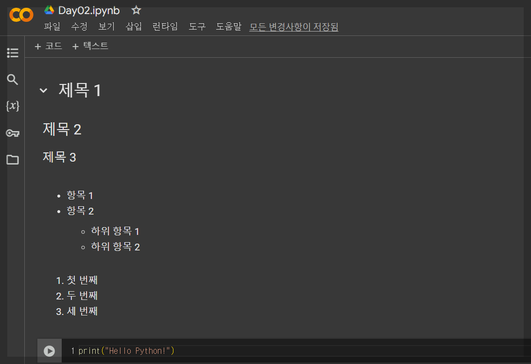 - Shift + Enter를 사용해 셀을 실행할 수 있으며, 코드 셀과 텍스트 셀을 쉽게 전환할 수 있습니다.